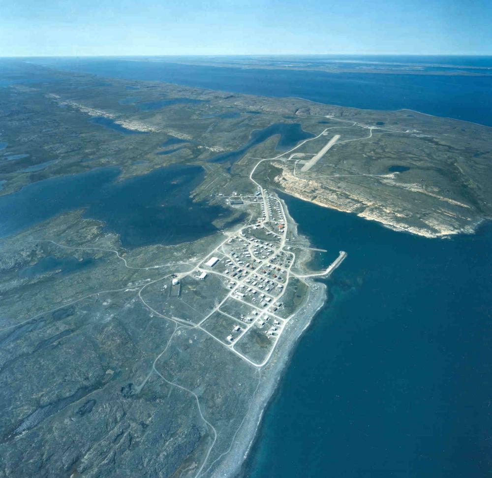 Sanikiluaq (pop. 812), the most southerly community of Nunavut, is located on the Belcher Islands in the Hudson Bay. The terrain is composed of many rocky cliffs that tower 50 to 155 meters above sea level. Many of these cliffs are nesting grounds for eider ducks, whose feathers (eiderdown) are collected from nests and made into duvets and outer-wear.